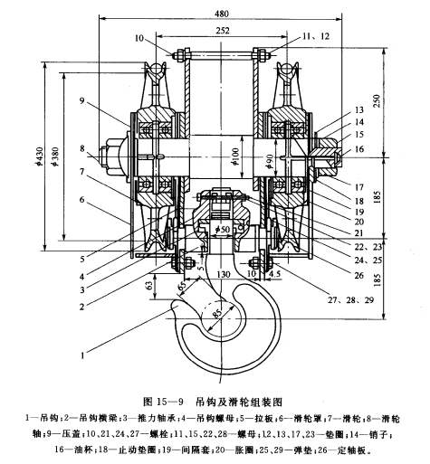1一滑輪,2一軸承,3一滑輪軸,4一滑輪外罩,5一吊鉤,6一吊鉤橫梁,7一推力軸承,8一吊鉤螺母,9一拉板。